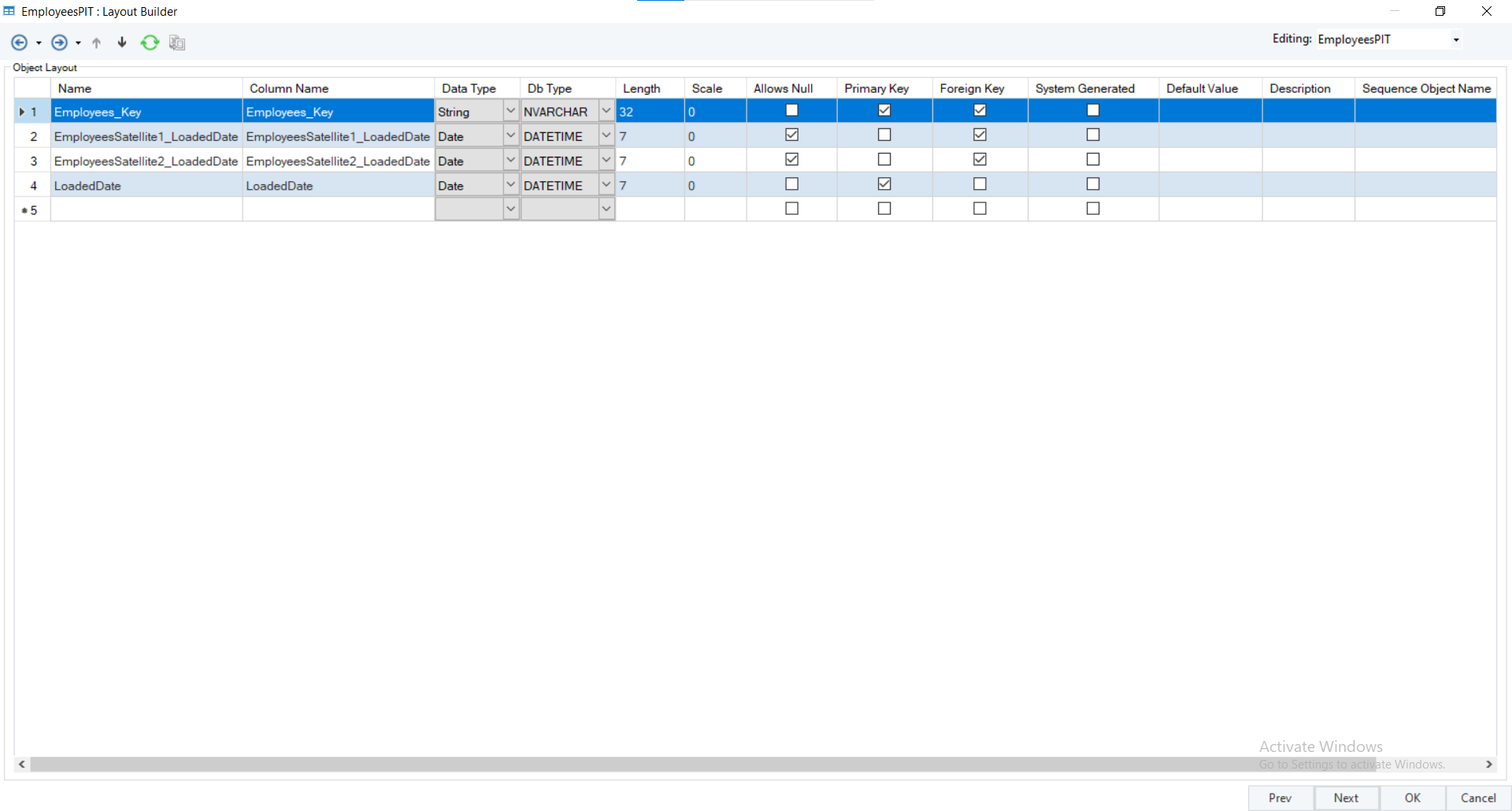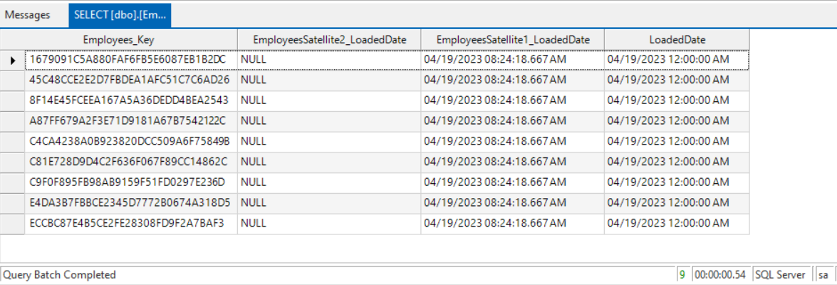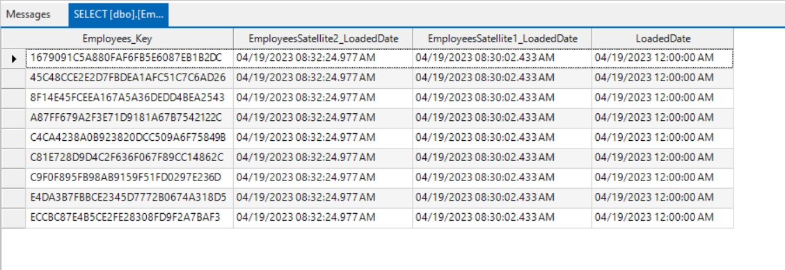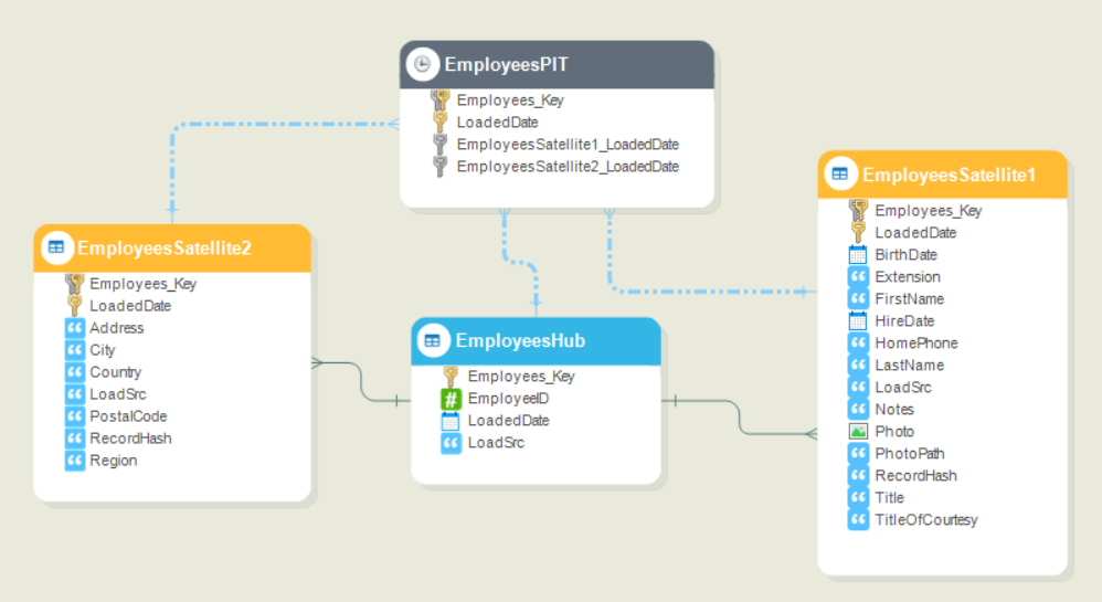 For example, the Employees_Key represents the primary key of Employees Hub, the EmployeesSatellite1_LoadedDate represents one of the primary keys of EmployeesSatellite1 Satellite, etc.
