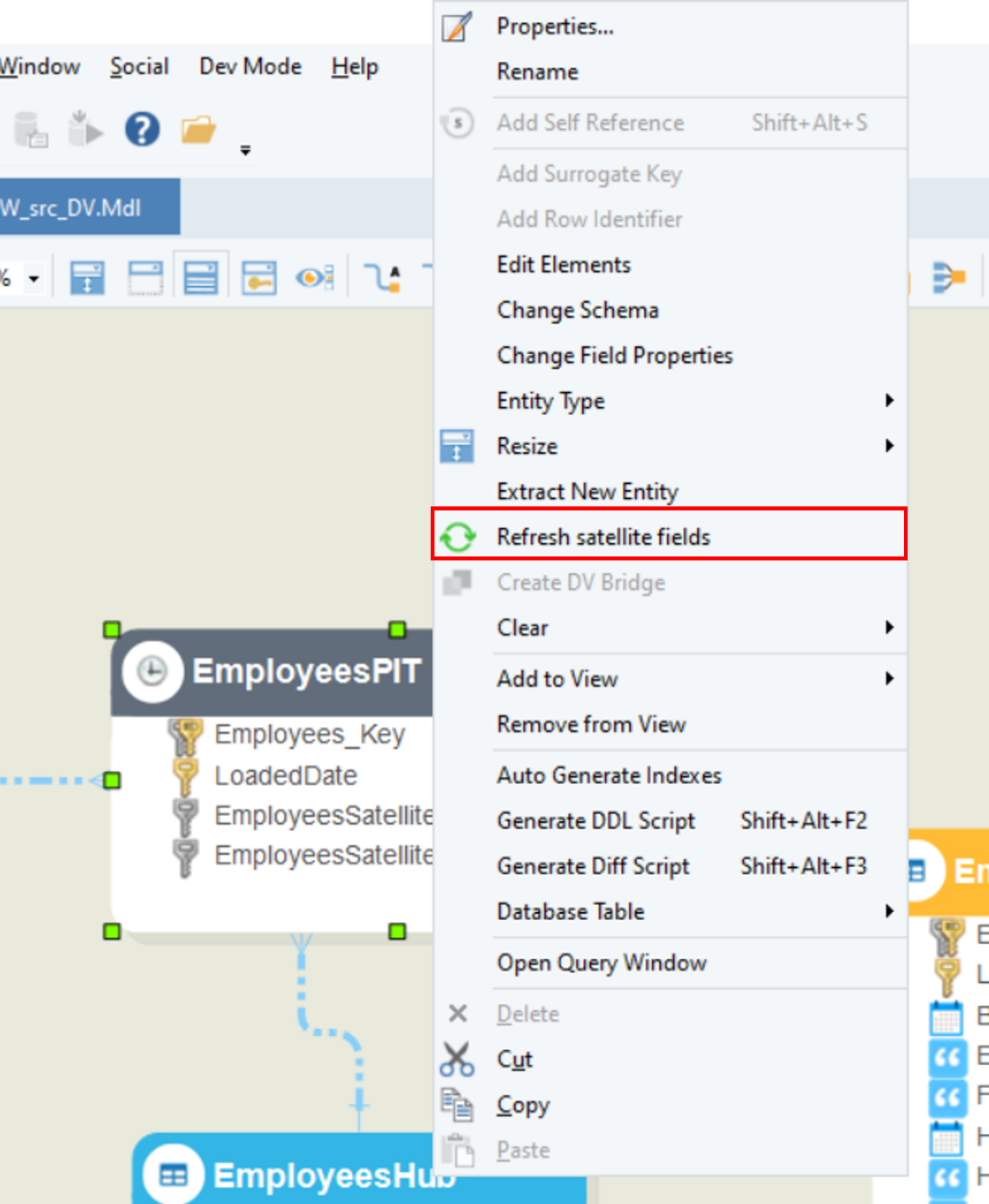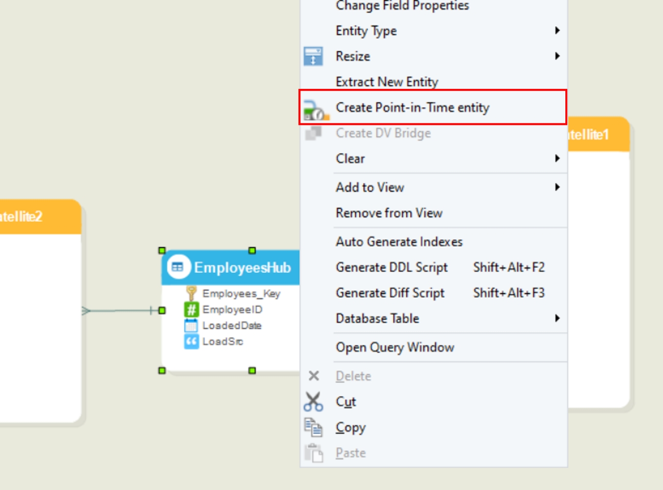 To add a PIT table to a data vault, right-click on the Hub or Link consisting of more than one Satellites and select the Create Point-in-Time entity option from the context menu.