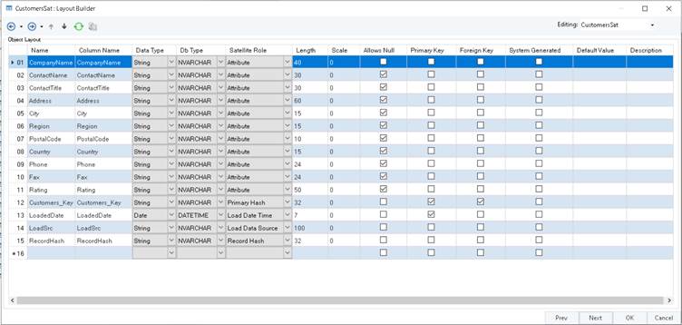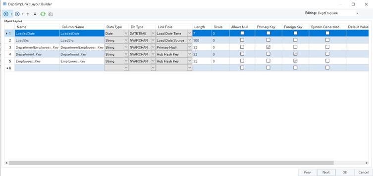 The Primary Hash key role is given to the identifying foreign key from the Parent hub table. This is the Hashed representation of the business key from the source system. This field, along with the Record date time stamp field, is marked as a composite primary key in Satellite tables.