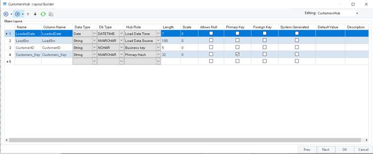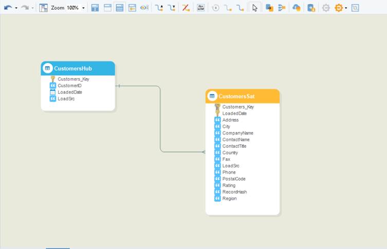 For example, a Customer object from the source system will be represented by a CustomersHub object in a data vault, and only the business key, CustomerID, will be stored uniquely in this hub.