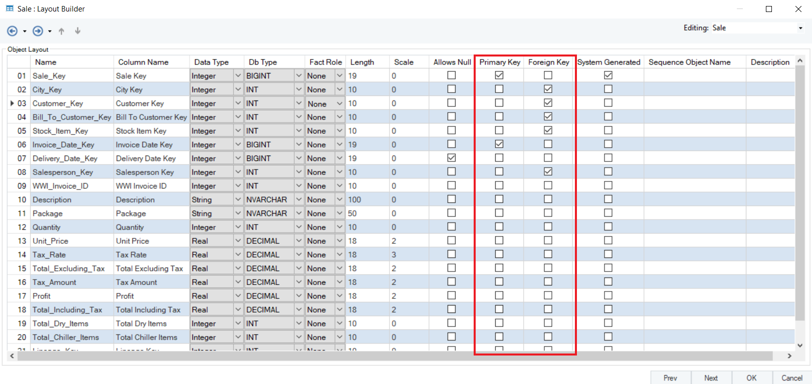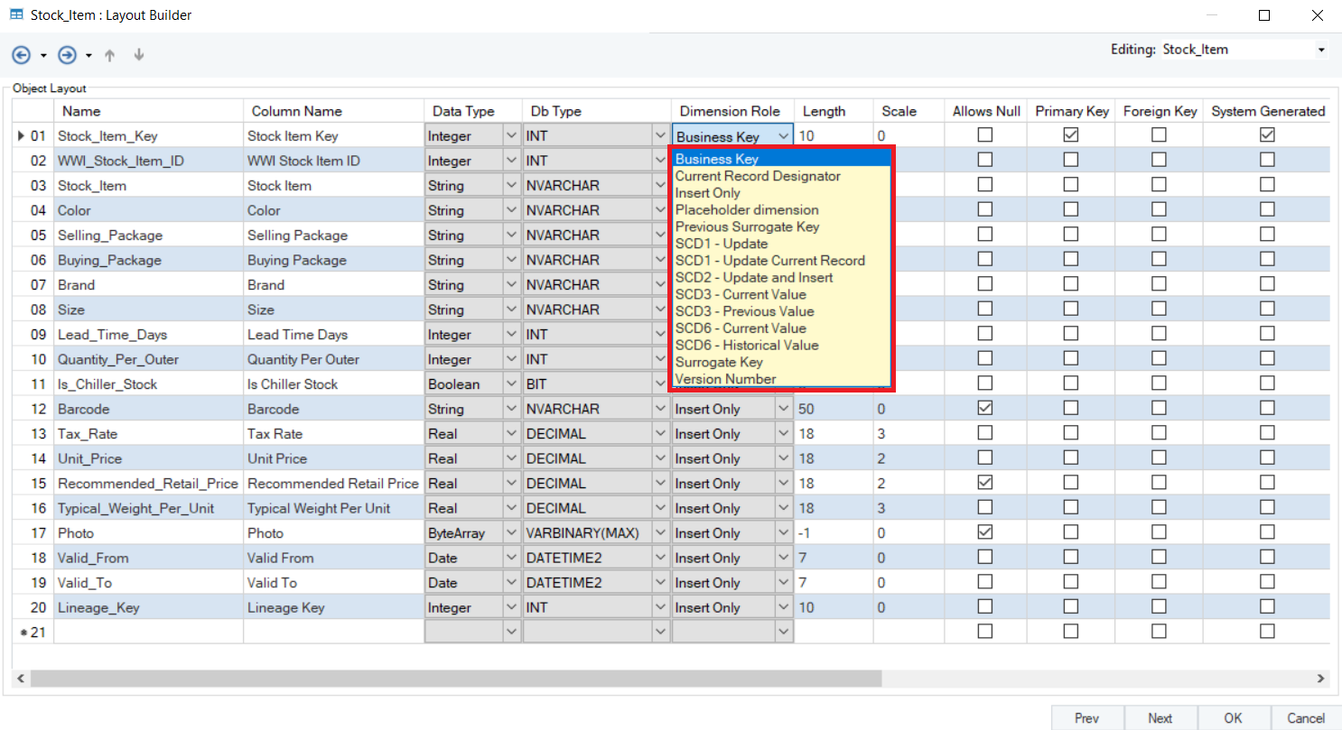 On the Layout Builder screen, you can make modifications to the table. Specify the Dimension Role (Business Key, Surrogate Key and SCD Types) and the Keys in the dimension table.