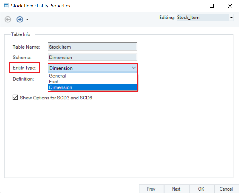 Once a Fact table has been specified, all the other tables in the model would be dimension tables, in this case only. To change an entity to a Dimension, follow steps 3 and 4. In the Entity Type drop-down, select Dimension. Click Next.