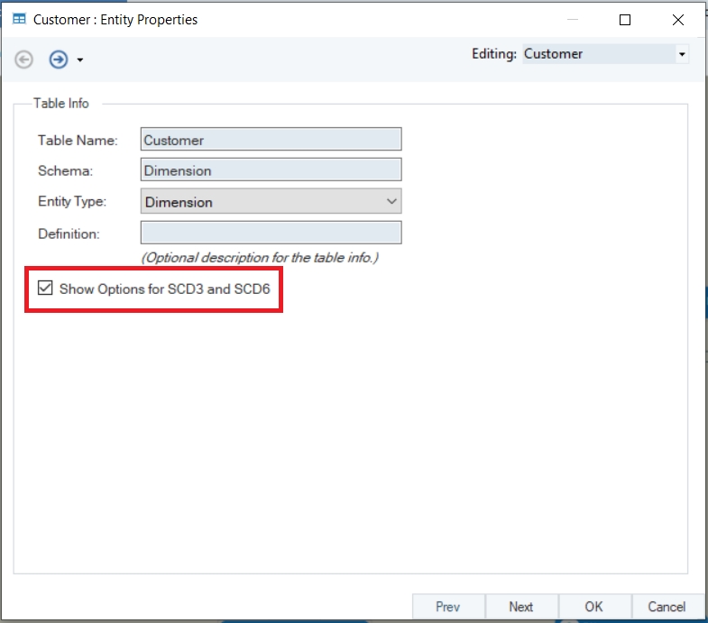 In this case, the Customer dimension entity already contains fields that can be assigned the surrogate key and row identifier dimension roles. However, if your entity layout does not contain such fields, you can create them via the options that appear in the context menu when you right-click on the entity.