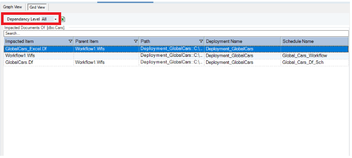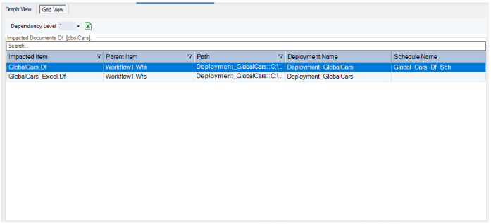 Within the Grid View, you can see a list of all the impacted items, the parent items for each of the listed items, the path of the deployed items, and a list of all the deployments and schedules that are impacted by the data item.