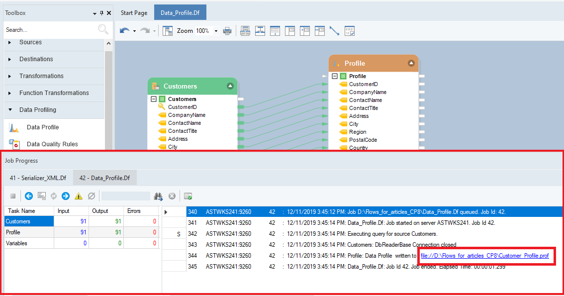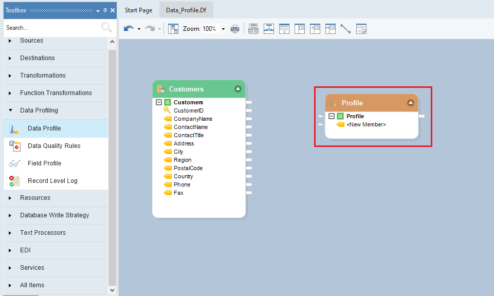 Drag-and-drop the Data Profile object onto the dataflow designer.