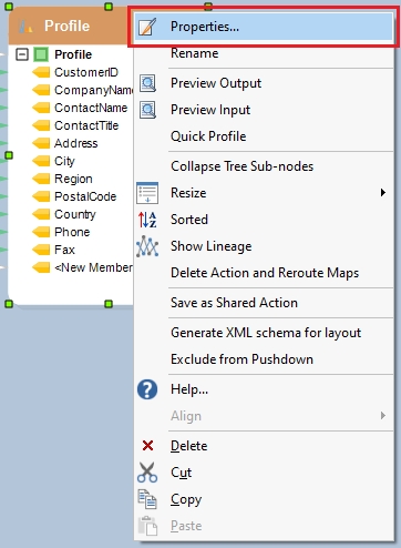 To configure the Data Profile object, right-click on its header and select Properties from the context menu.
