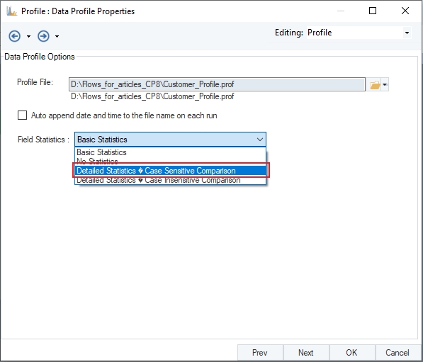 Detailed Statistics – Case Insensitive Comparison: Additional statistics are captured by the Data Profile, using case insensitive comparison for strings.
