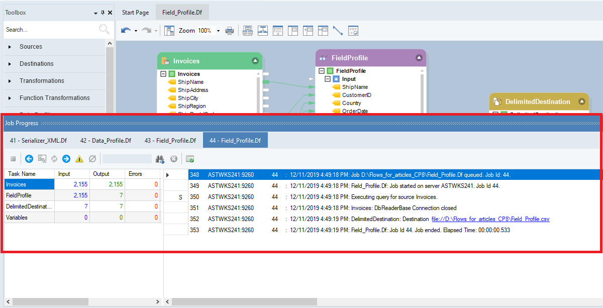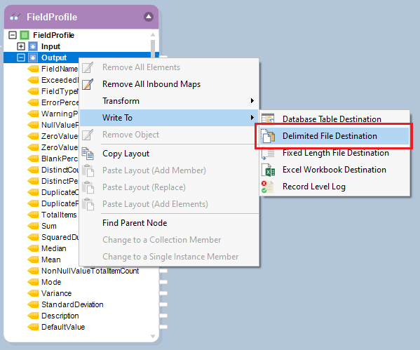 We want to collect detailed statistics from some of these fields of data and write it to a Delimited File Destination. For this purpose, we will use Astera's Field Profile feature.