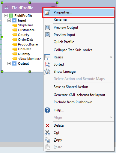 One-by-one map ShipName, CustomerID, Country, OrderDate, ProductName, UnitPrice, and Quantity from the source object to the Field Profile object’s Input node.