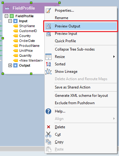 Right-click on Field Profile object’s header and select Preview Output from the context menu.