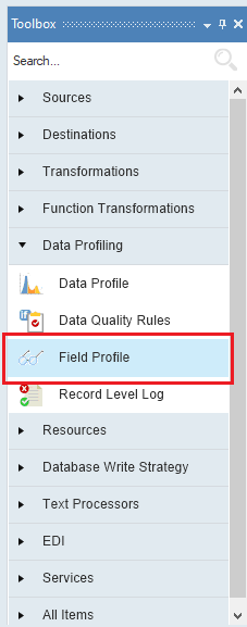To get a Field Profile object from the Toolbox, go to Toolbox > Data Profiling > Field Profile. If you are unable to see the toolbox, go to View > Toolbox or press Ctrl + Alt + X.