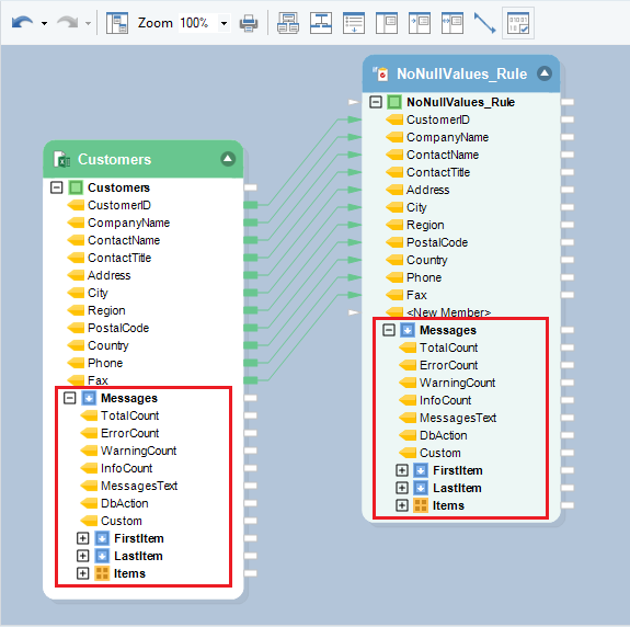In addition to the standard logging functionality, Astera provides a special Data Quality Mode option, useful for advanced profiling and debugging. When a dataflow is created/opened in Data Quality Mode, most objects on the dataflow show the Messages node with output ports.