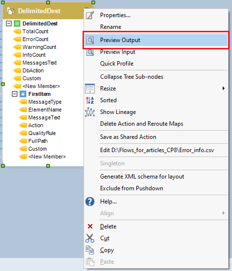 Right-click on the header of the destination object and select Preview Output from the context menu.