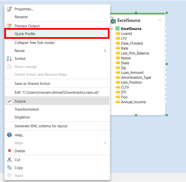 To view field statistics at a particular object in the dataflow, right-click on the object’s header and select Quick Profile.