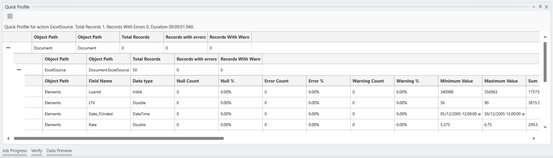 The Quick Profile option in Astera gives users the ability to preview field statistics of any set-level object in the dataflow in design time. It provides information such as the data type, minimum/maximum values, data count, error count, etc which can be used to identify and correct data quality issues while designing flows.