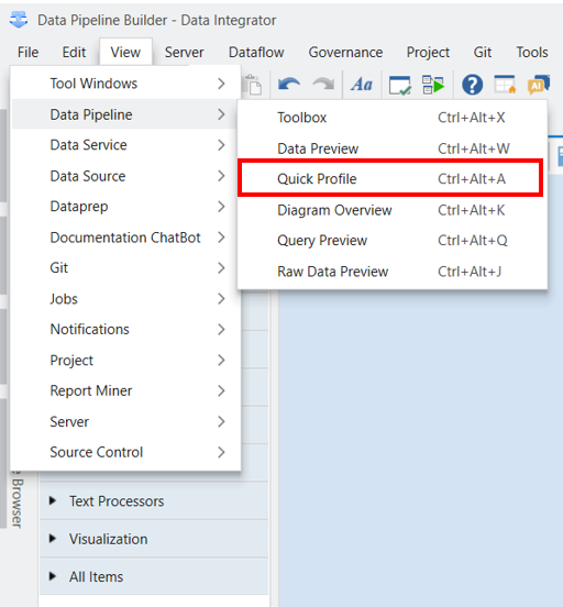 The Quick Profile window can be viewed for an entire flow by clicking View > Data Pipeline > Quick Profile or using the shortcut key Ctrl+Alt+A.