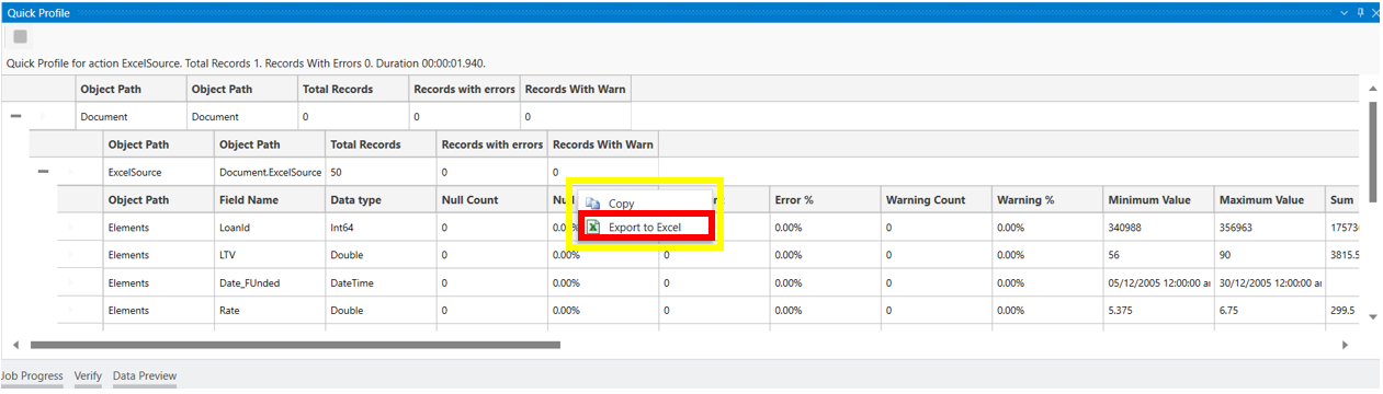 Note: The data processed by Quick Profile is in-memory and can only be stored permanently if exported to an Excel file. To do that, right-click anywhere in the Quick Profile window and select Export to Excel.