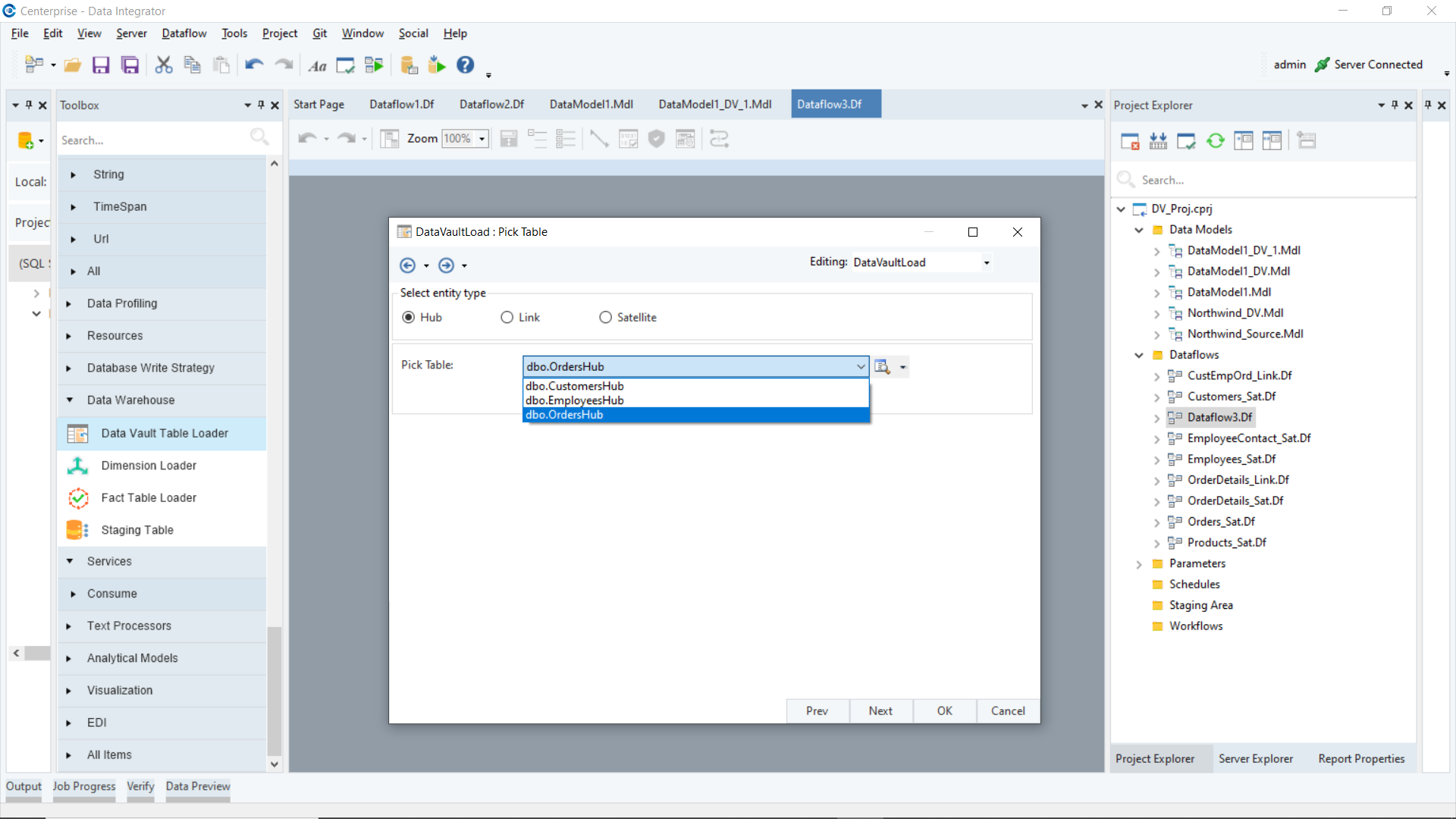 The Data Vault Loader object in the Data Warehouse section of the Toolbox allows you to write data to a Data Vault Entity such as a Hub, Link, or Satellite table. You can connect to a deployed model and then choose the entity type and table that you want to write your data to.