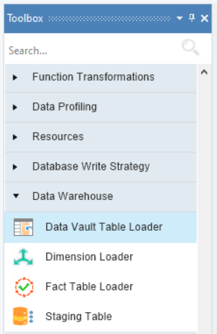 To get the Data Vault Loader object from the Toolbox, go to Toolbox > Data Warehouse > Data Vault loader.