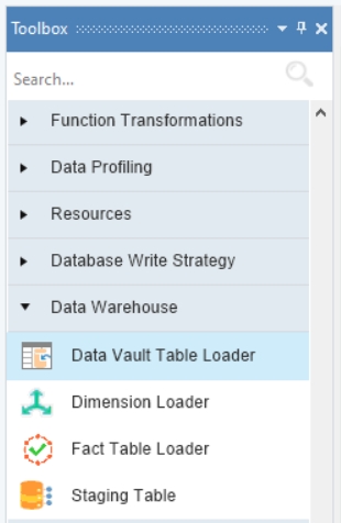 - To get the Data Vault Loader object from the Toolbox, go to Toolbox > Data Warehouse > Data Vault loader.