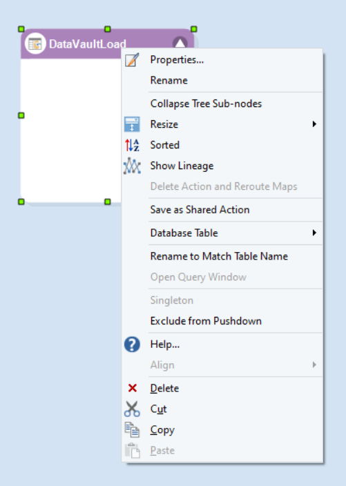 Note: Based on the selected entity (Hub, Link, or Satellite), different fields will appear in the configured Data Vault Loader object, and only some of these will be mappable fields. The Load Data Source (LoadSc) and Load Date Time (LoadedDate) fields are present in all configured Data Vault Loader objects, regardless of the chosen entity.
