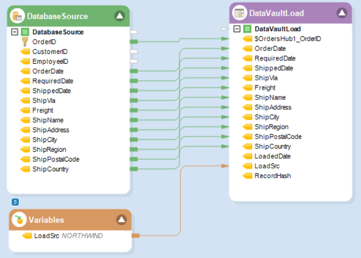 For our use case, we will be using the Data Vault Loader object to write data to an Orders Hub, a Customers-Orders Link, and an Orders Satellite.
