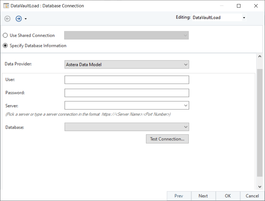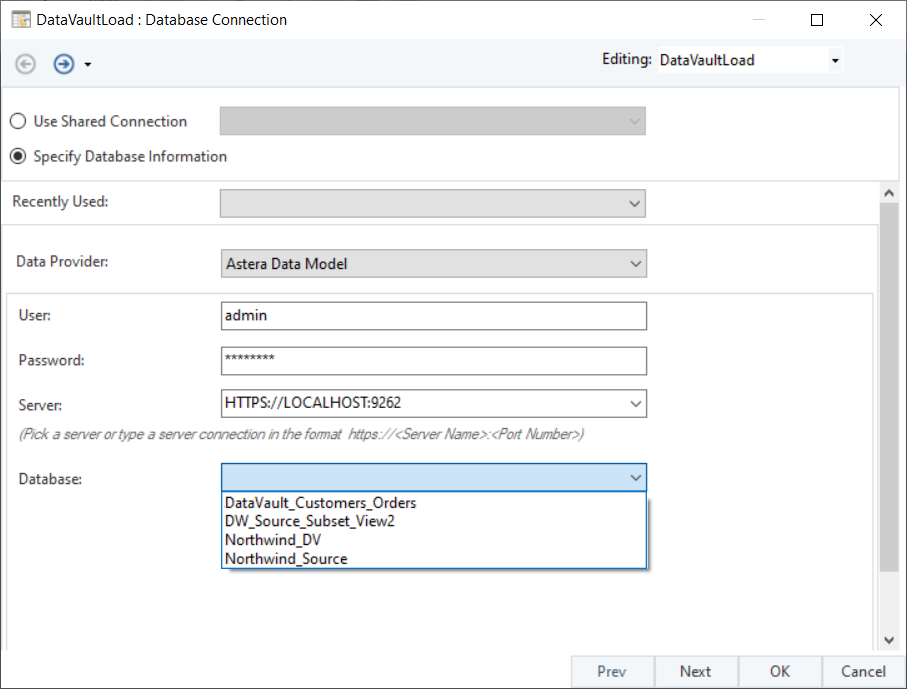 Once you have provided your credentials and a server connection, you can select a deployed, Data Vault model from the Database dropdown menu, which consists of the entities that need to be populated.