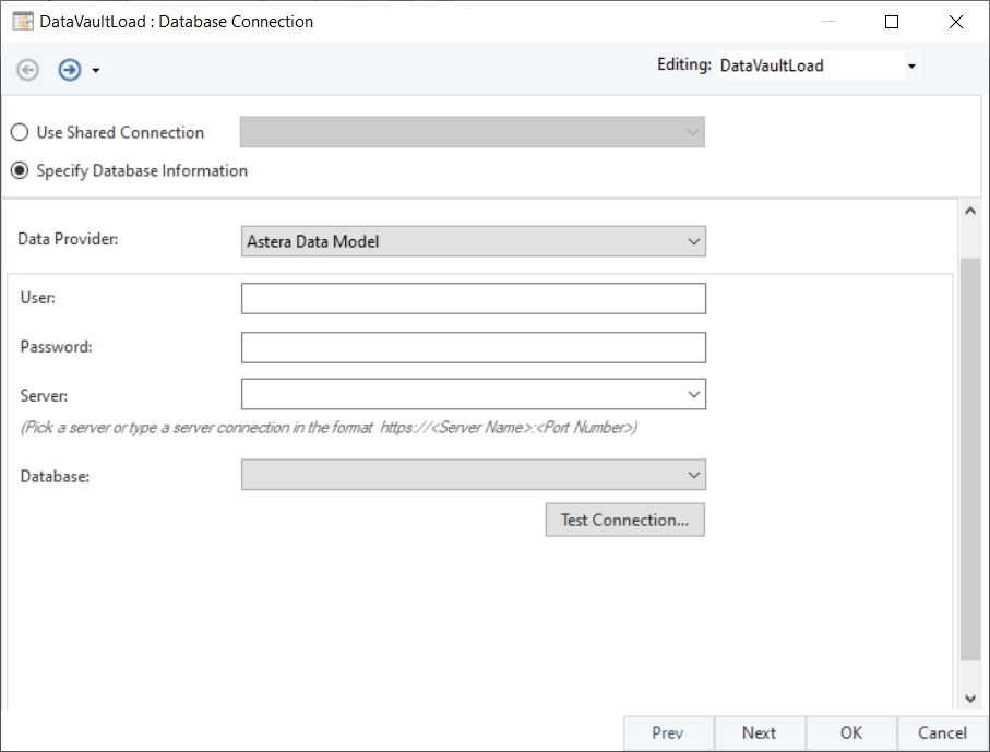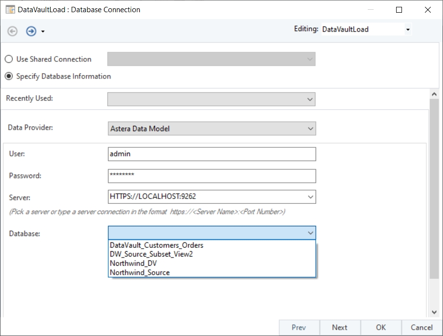 - Once you have provided your credentials and a server connection, you can select a deployed, Data Vault model from the Database dropdown menu, which consists of the entities that need to be populated.
