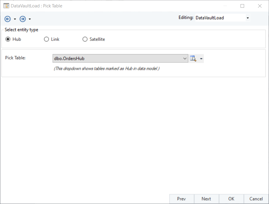 Now, click Next. On the Pick Table screen, you select an entity type: a Hub, Link, or Satellite. First, select the Hub entity type.