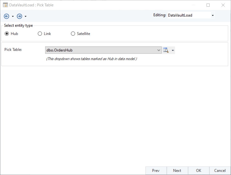 - Now, click Next. On the Pick Table screen, you select an entity type: a Hub, Link, or Satellite. First, select the Hub entity type.