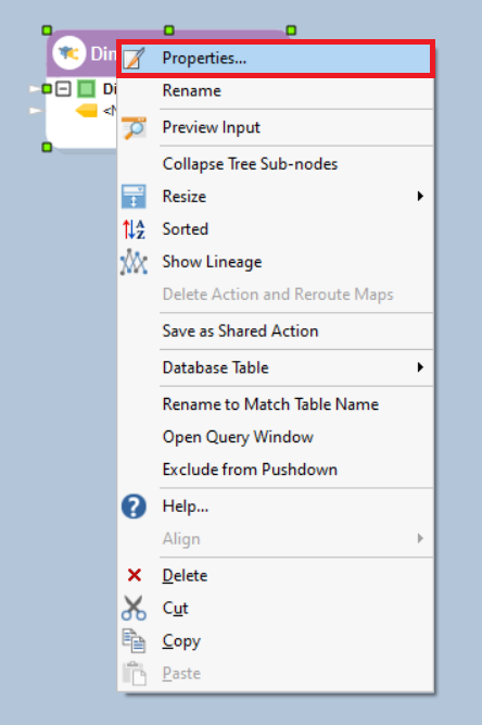 To open the properties window of the Dimension Loader object, right-click on it and select Properties from the context menu. Alternatively, you can double-click on the object.