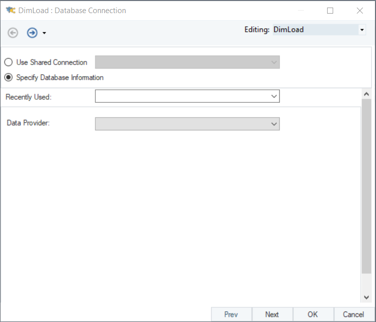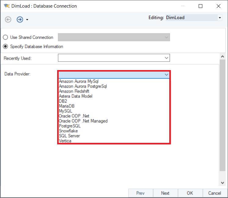 On the Database Connection screen, you can choose a data provider from the options available in the Data Provider dropdown menu.