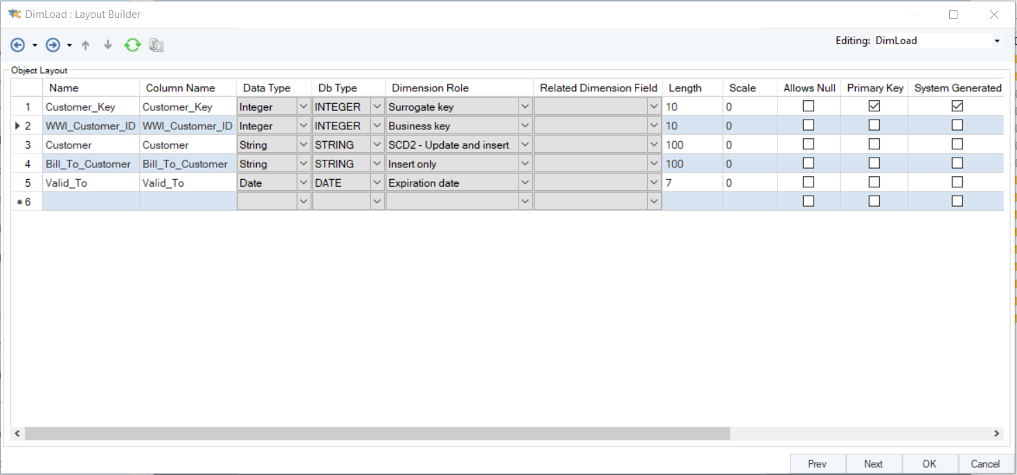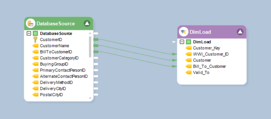 This model contains four dimension entities, one fact entity, and a date dimension entity. In this example, we’ll be loading data into the Customer dimension using the Dimension Loader object.