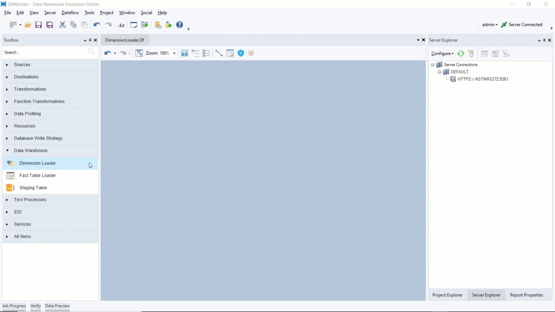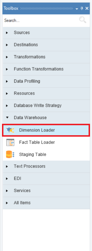 To get the Dimension Loader object from the toolbox, go to Toolbox > Data Warehouse > Dimension Loader.