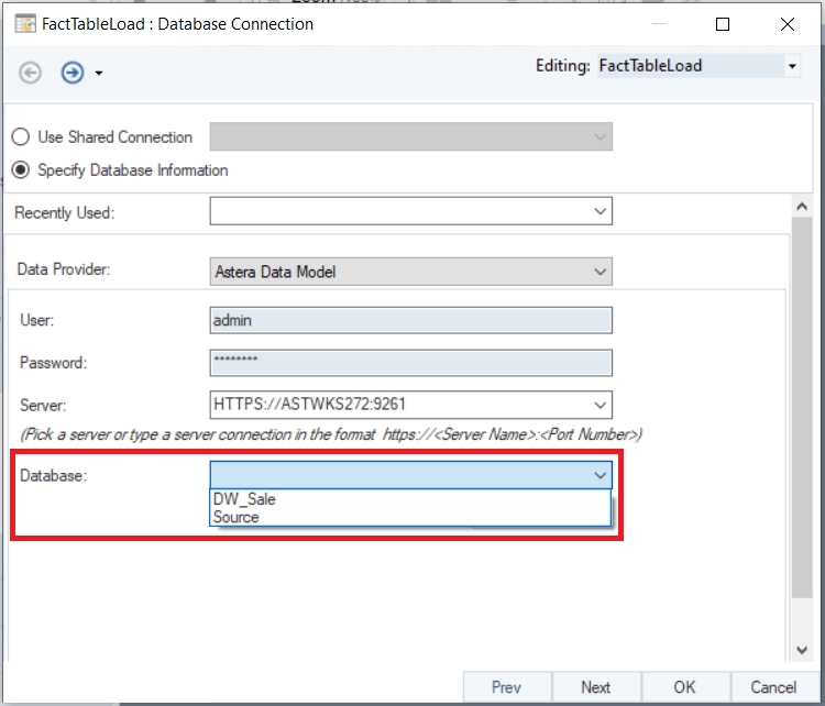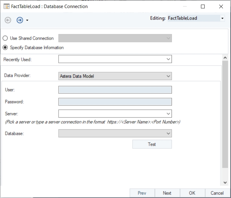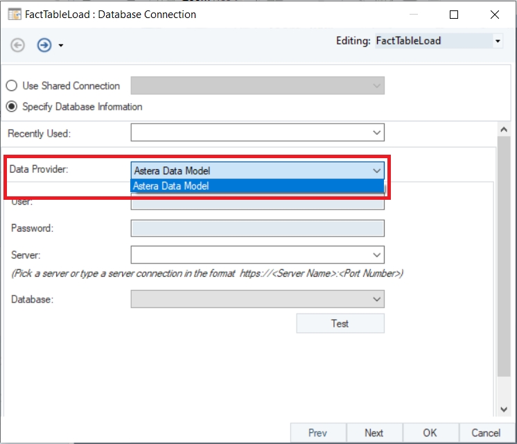 On the Database Connection screen, you’ll notice that the Data Provider dropdown menu is limited to just one option: Astera Data Model. This option represents the data models that are deployed on the server and are available for usage.