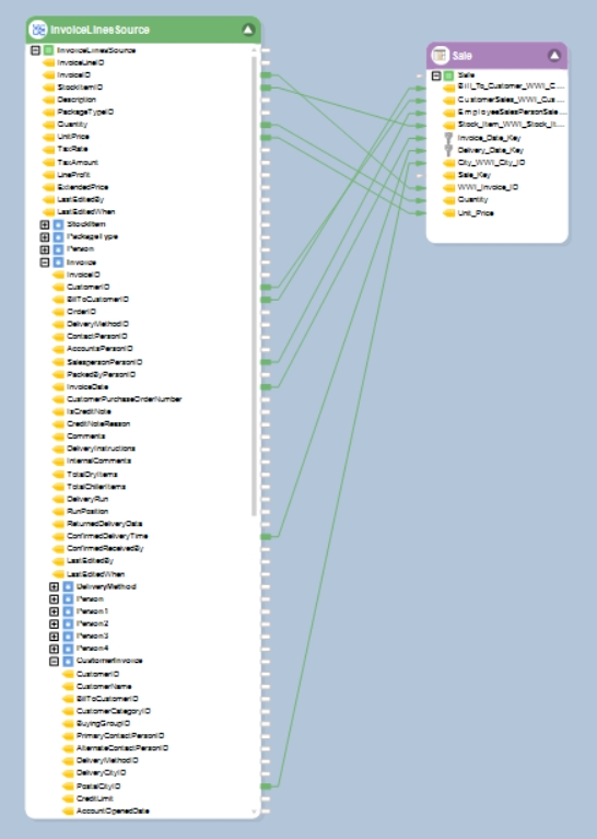 This model contains four dimension entities, one fact entity, and a date dimension entity. In this example, we’ll be loading data into the Sale fact entity using the Fact Table Loader object.