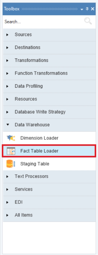 To get the Fact Table Loader object from the toolbox, go to Toolbox > Data Warehouse > Fact Table Loader.