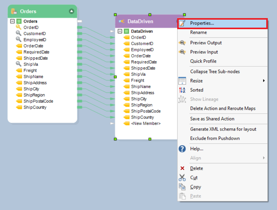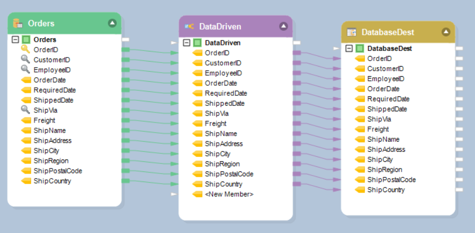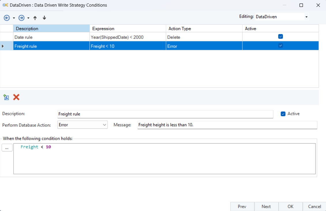 Assume a scenario in which Orders data from a Database Table Source is written to a Database Table Destination. We want to DELETE those records where ShippedDate is before the year 2000 and declare those records where Freight is less than 10 as ERROR. We will use the Data Driven write strategy object to achieve this task.