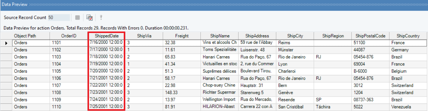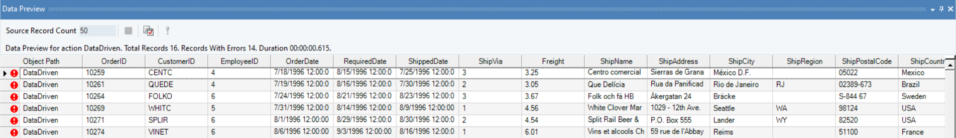 You can see that Astera has appended an error message with the records where Freight is less than 10. You can create an error log of these records or load them into a database if you want.