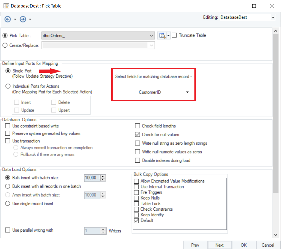 It is important to note here that while working with Database Write Strategies, Single Port is selected. Once you check the Single Port option in the Database Table Destination object, a box will appear in which you will have to specify a field for matching database record. In our case, we will select OrderID.