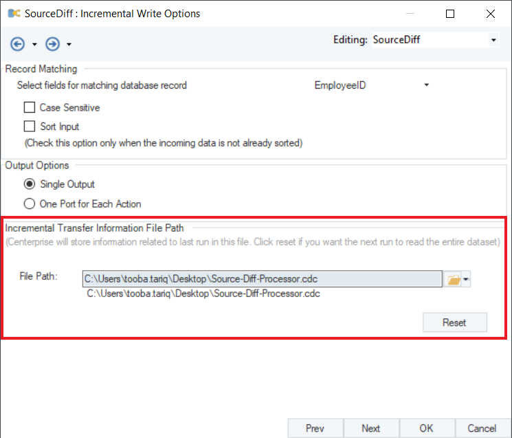 The third section in the Incremental Write Options window is the Incremental Transfer Information File Path option. Here, you must specify the file path where you want to store information related to the last run.