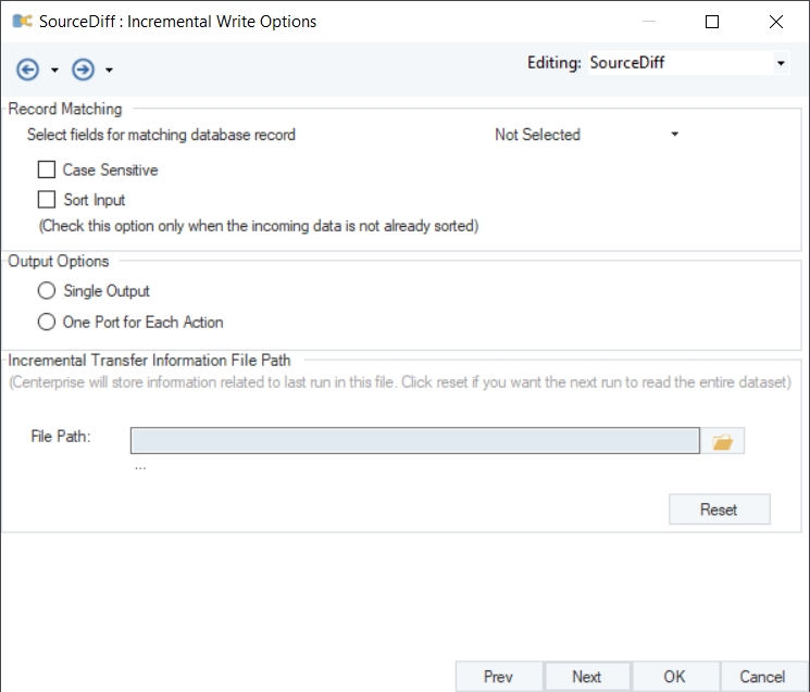 The Source Diff Processor object is one of the Database Write Strategies offered in Astera. It works like the Database Diff Processor, however, unlike the Database Diff Processor, it is used to perform write actions (such as Insert, Update and Delete) on file destinations. It stores a snapshot of your data processed in the first run in a CDC file. So, the next time you run it, it will only import the new records.