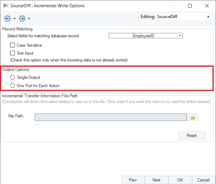 One Port for Each Action is used when you want to further transform or log your data. If you select One Port for Each Action, you will get separate nodes for each Diff action in the Source Diff Processor’s object.
