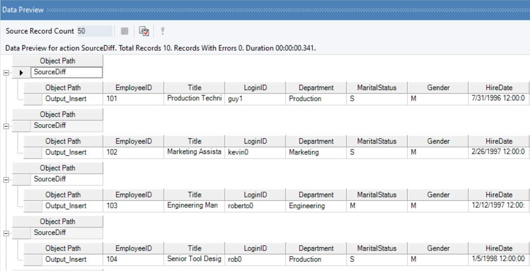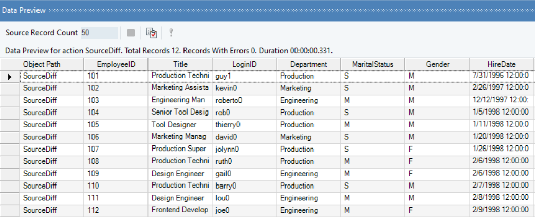 We have a sample Employees dataset coming in from an Excel Workbook Source. Initially, we had records of 10 employees but later on, 2 more were added in the source dataset. We wish to apply a database write strategy that can read the data incrementally from file sources. To achieve this, we will use the Source Diff Processor in Astera.