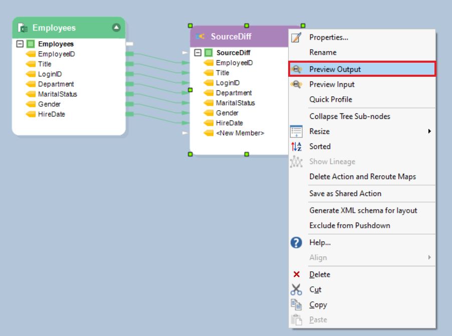 Now, right-click on the Source Diff Processor object’s header and select Preview Output.