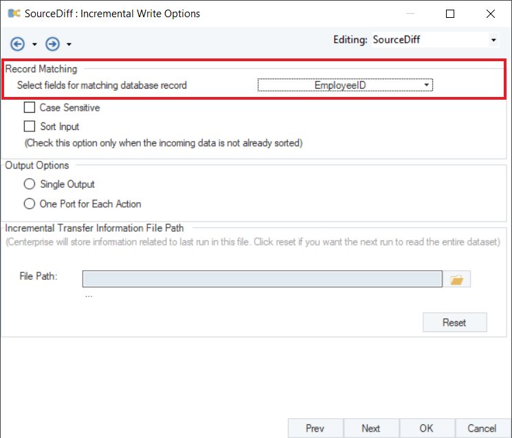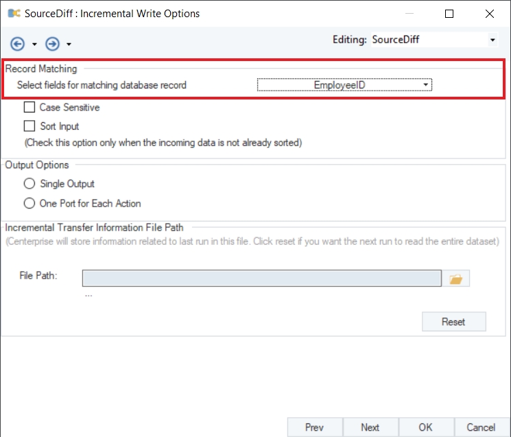 Here, you have to specify the Record Matching field. This field is used to match and compare the incoming and existing records. We will select EmployeeID as the Record Matching field.
