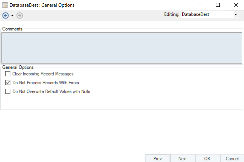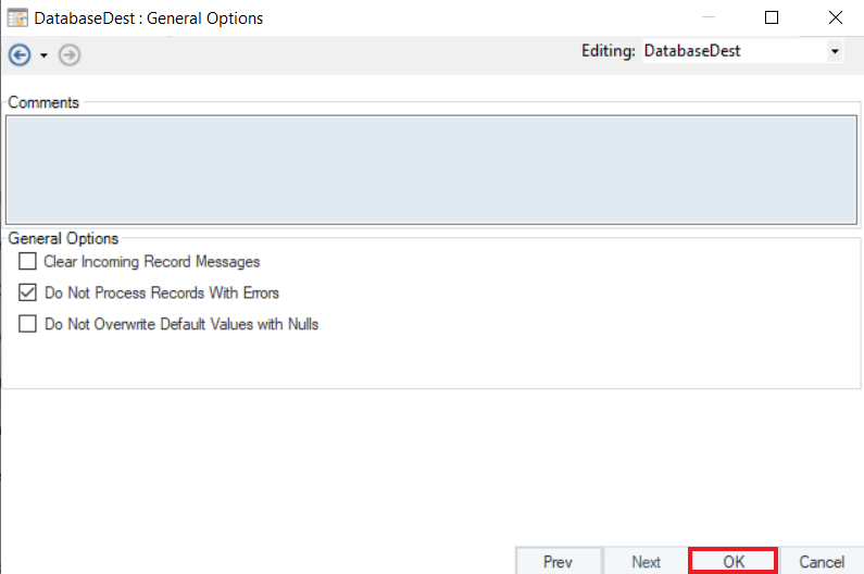 The DatabaseDest object is now configured according to the settings made in the properties window.