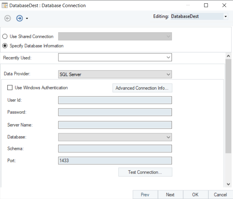 This is where you select the specific database provider you want to connect to. For instance, if you want to write you data to a SQL database, select SQL Server from the list. The connection details will vary according to the data provider selected.