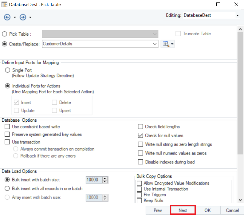 Keep Nulls: Preserves null values in the destination table regardless of the settings for default values. When not specified, null values are replaced by default values where applicable.