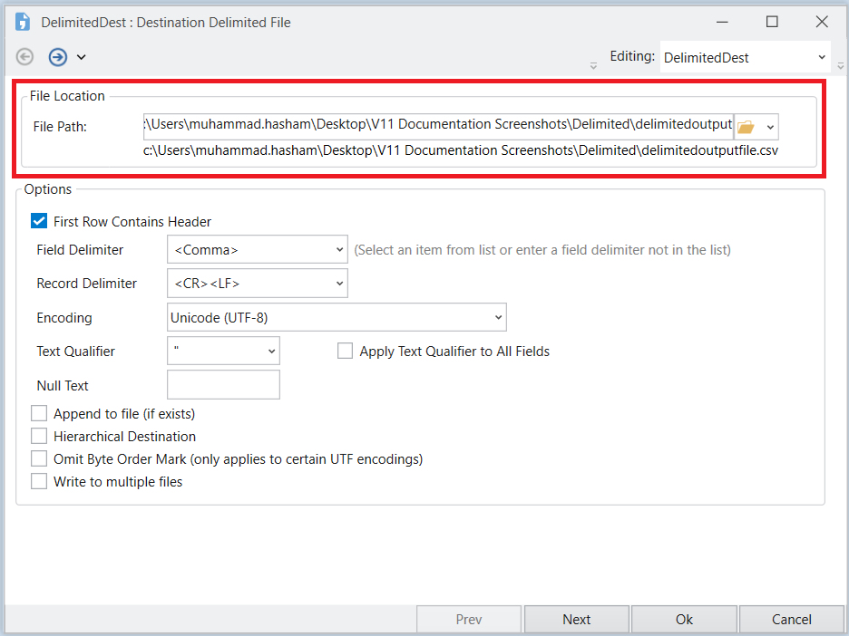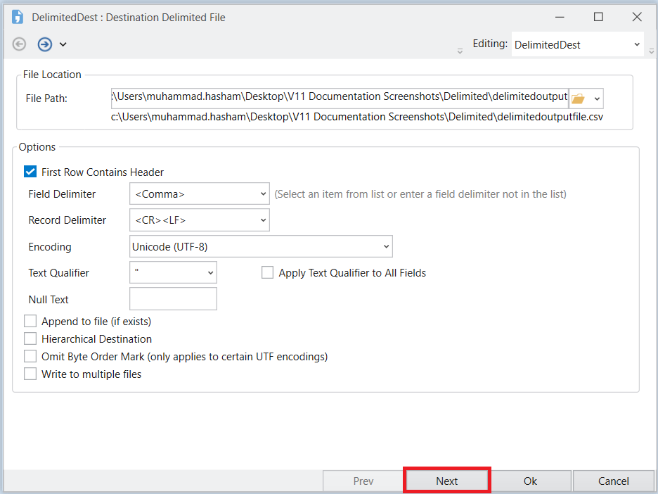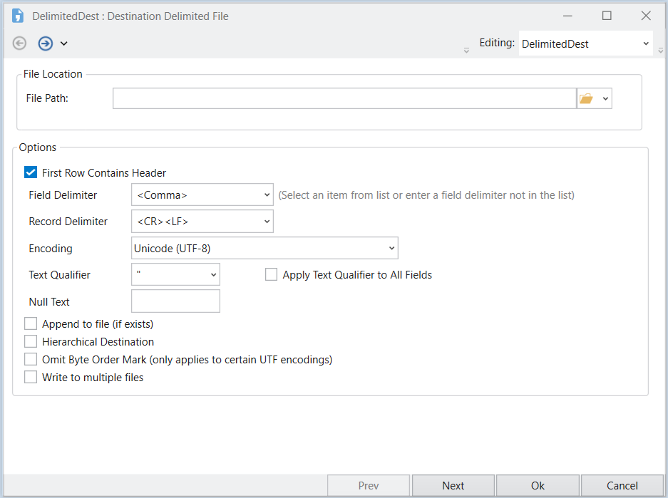 Astera’s Delimited File Destination provides the functionality to write data to a delimited file. Delimited File Destination gives you the ability to control the structure and content of file including numeric, date, and Boolean formats, encodings, text qualifiers (quotes), and character sets. You can choose to create a new file or append data to an existing file.